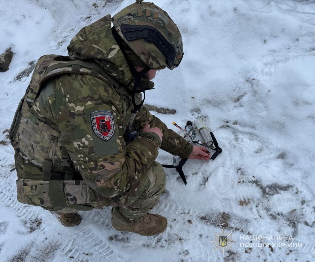 Поліція наголошує: у разі виявлення на землі будь-яких боєприпасів, квадрокоптерів, дронів літакового типу, гранат, мін та інших вибухонебезпечних чи невідомих предметів не підходьте близько і не торкайтеся їх.