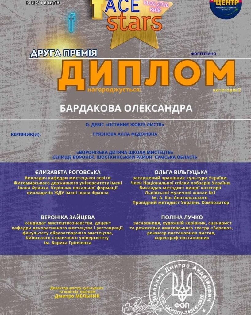 У місті Київ відбувся Міжнародний конкурс мистецтв “Ace Stars”, в якому блискучу перемогу здобула Олександра Бардакова. Про це повідомили на сторонці Воронізької дитячої школи мистецтв.