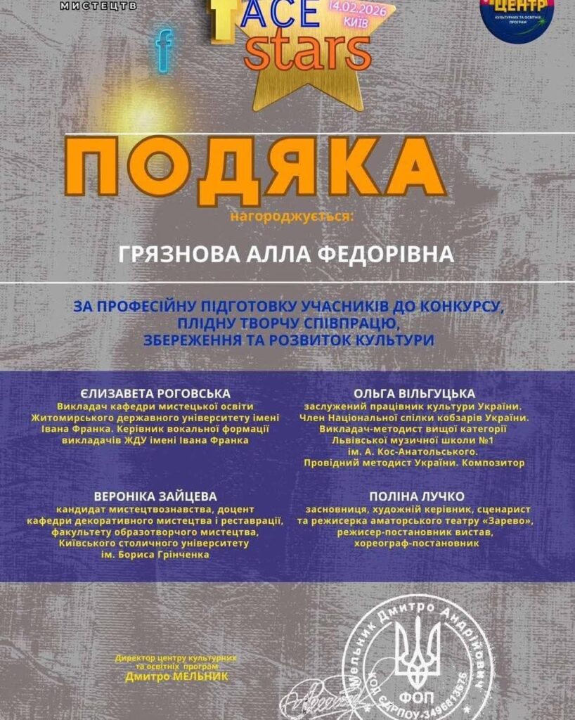 Високий результат учениці – заслуга викладачки Алли Грязнової, чия професійність, підтримка й уміння надихати сприяють розкриттю творчого потенціалу учнів. Попереду нові творчі злети, яскраві сцени та подальші перемоги.