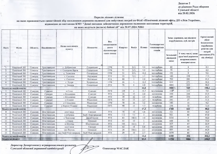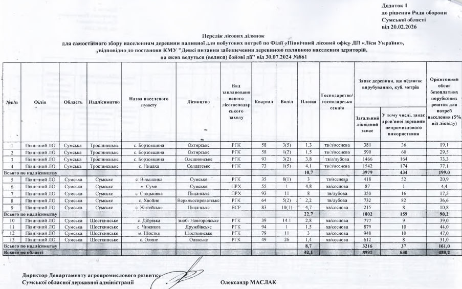 2. Перелік лісових ділянок для самостійного збору населенням деревини паливної для побутових потреб по ОКАП «Сумиоблагроліс», відповідно до постанови КМУ «Деякі питання забезпечення деревиною паливною населення територій, на яких ведуться (велися) бойові дії» від 30.07.2024 №861: https://shostka-rada.gov.ua/wp-content/uploads/2026/03/1468-Pro-rishennya-rady-oborony-vid-20.02.2026-DO-VIDOMA-ne-vidpovidaty-5.pdf