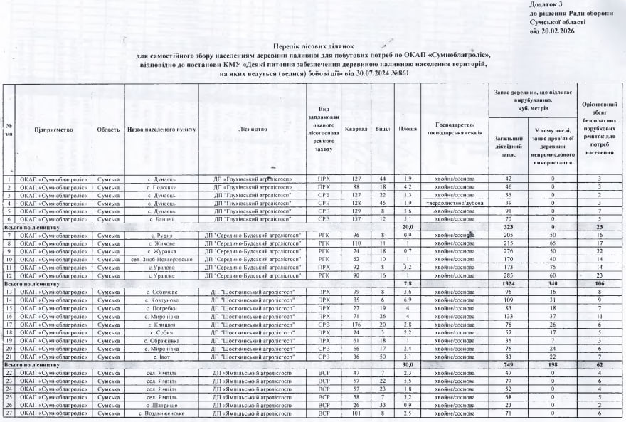 3. Перелік лісових ділянок на яких припиняється самостійний збір населенням деревини паливної для побутових потреб по Філії «Північний лісовий офіс» ДП «Ліси України», відповідно до постанови КМУ “Деякі питання забезпечення деревиною паливною населення територій; на яких ведуться (велися) бойові дії” від 30.07.2024 №861: https://shostka-rada.gov.ua/wp-content/uploads/2026/03/1468-Pro-rishennya-rady-oborony-vid-20.02.2026-DO-VIDOMA-ne-vidpovidaty-4.pdf