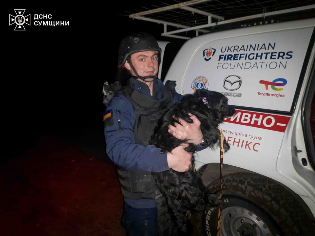 На спеціальному бронеавтомобілі ДСНС, вдалося доправити в безпечне місце трьох жінок та песика.