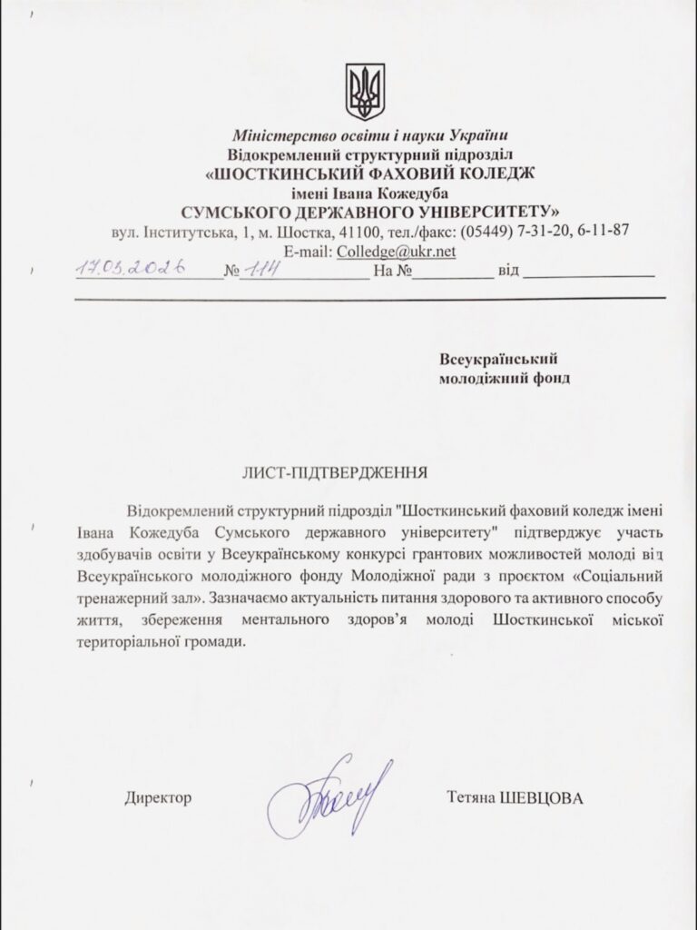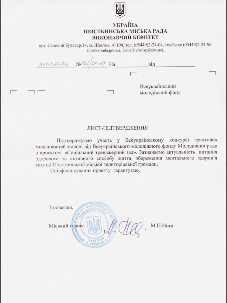 У Шостці підписано стратегічно важливий документ щодо співфінансування проєкту «Соціальний тренажерний зал» з міського бюджету. Угоду укладено між Молодіжна рада при виконавчому комітеті ШМР та міським головою Миколою Ногою.