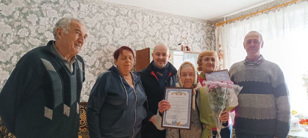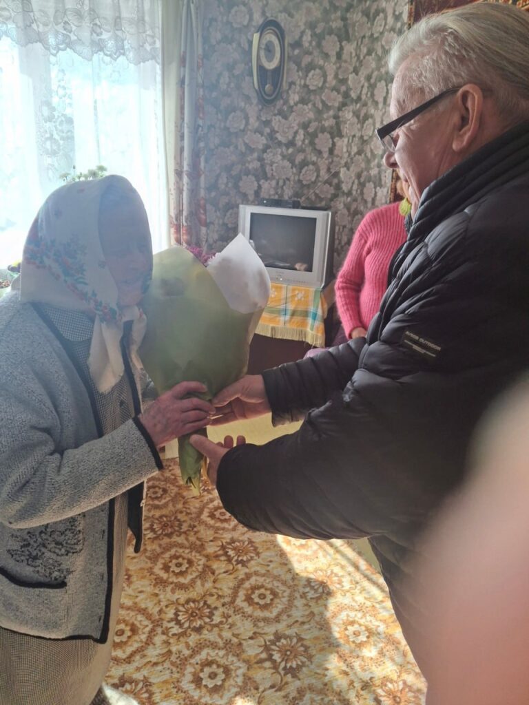 Передали теплі слова вітання ювілярці і від голови Сумської обласної військової адміністрації Олега Григорова, т.в.о. голови Шосткинської районної військової адміністрації Оксани Тарасюк та Департаменту з питань соціальної політики Сумської обласної державної адміністрації. З побажаннями здоров’я і перемоги вручили Почесну грамоту, квіти та подарунки.
