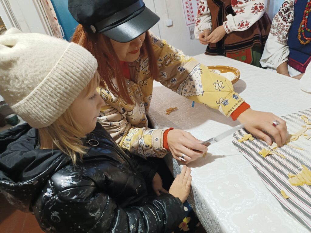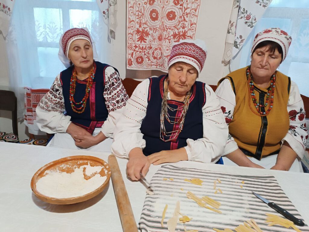 Ми також доторкнулися до елементу відтворення весільного обряду. Учасниці гурту “Панянки з Землянки” провели майстер-клас з ліплення пташок з тіста для весільного короваю. Як ведеться за обрядом, жіночки заспівали пісню: “Ніхто не вгадає, Ніхто не вгадає, що в нас в короваї. Три фунти мучиці, три ложки водиці та три фунти масла, яєць півтораста“.
