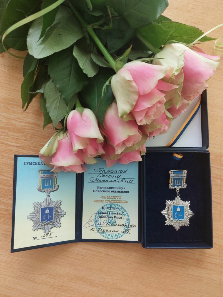 Перед початком засідання голова Сумської обласної ради Олексій Романько вручив Оксані Тарасюк Почесну відзнаку Сумської обласної ради «За заслуги перед Сумщиною» ІІІ ступеня. Він відзначив її стійкість, професійність та незламність у виконанні важливих завдань під час воєнного стану.