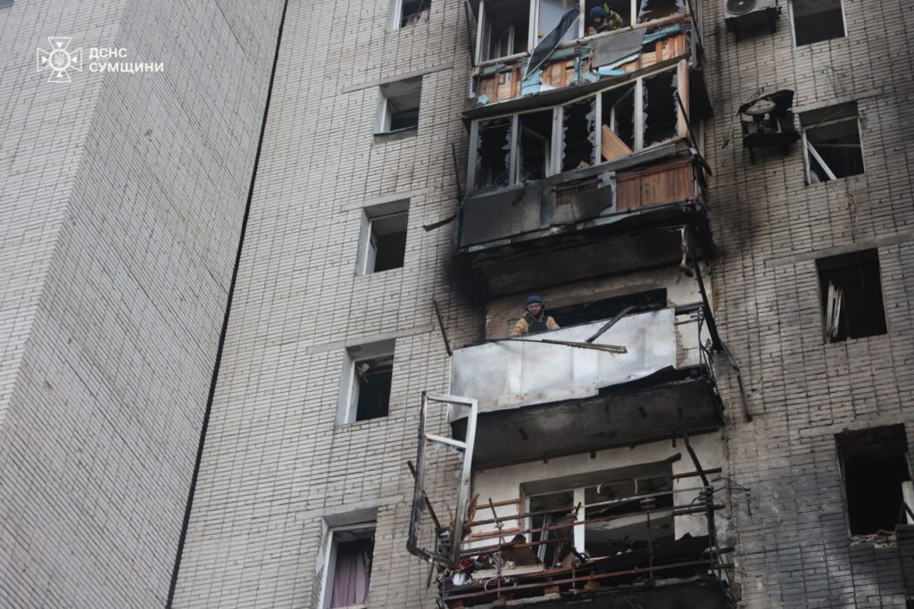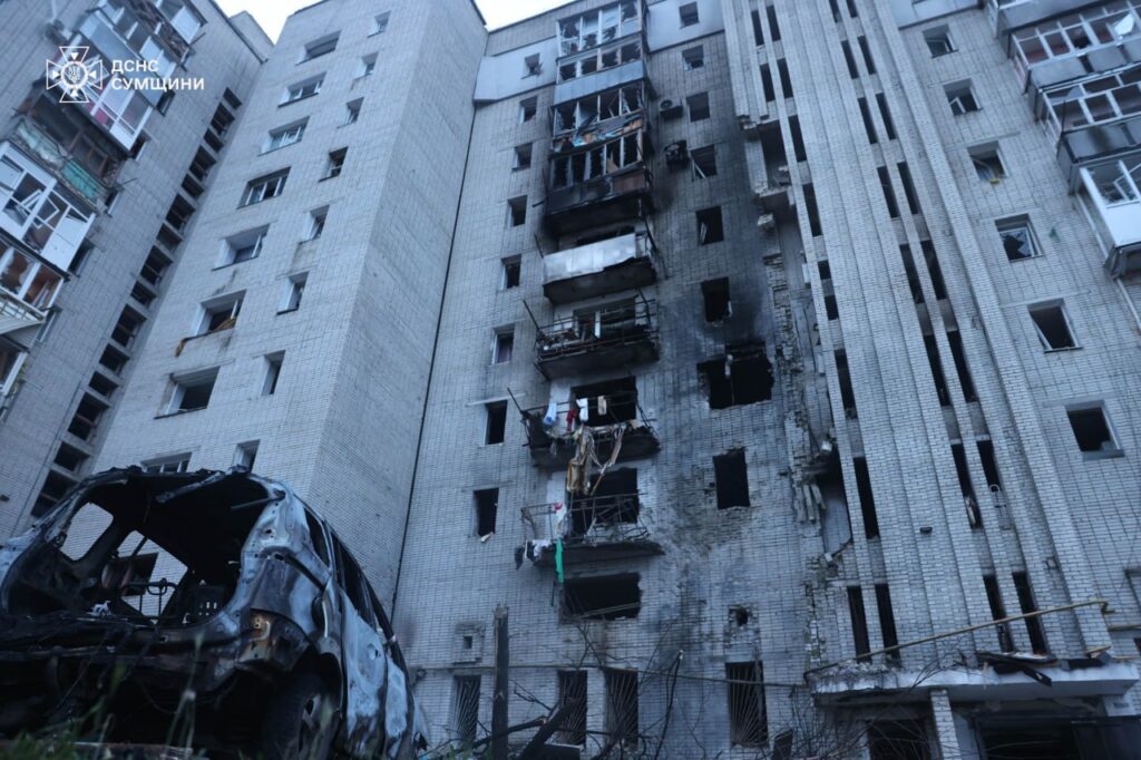 Рятувальники безупинно працюють на місці ворожого удару в Охтирці, розгорнуто мобільний пункт ДСНС