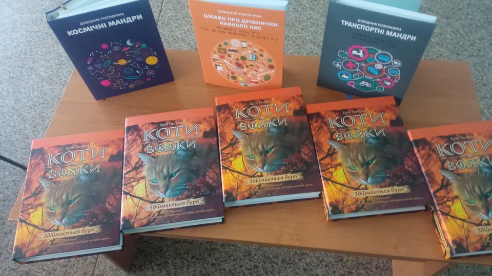 Зокрема, бібліотечний фонд поповнився п’ятьма книгами популярної серії «Коти-вояки», яка здобула світову популярність, а також трьома виданнями із серії «Довідник розумника» — пізнавальною літературою для допитливих читачів.