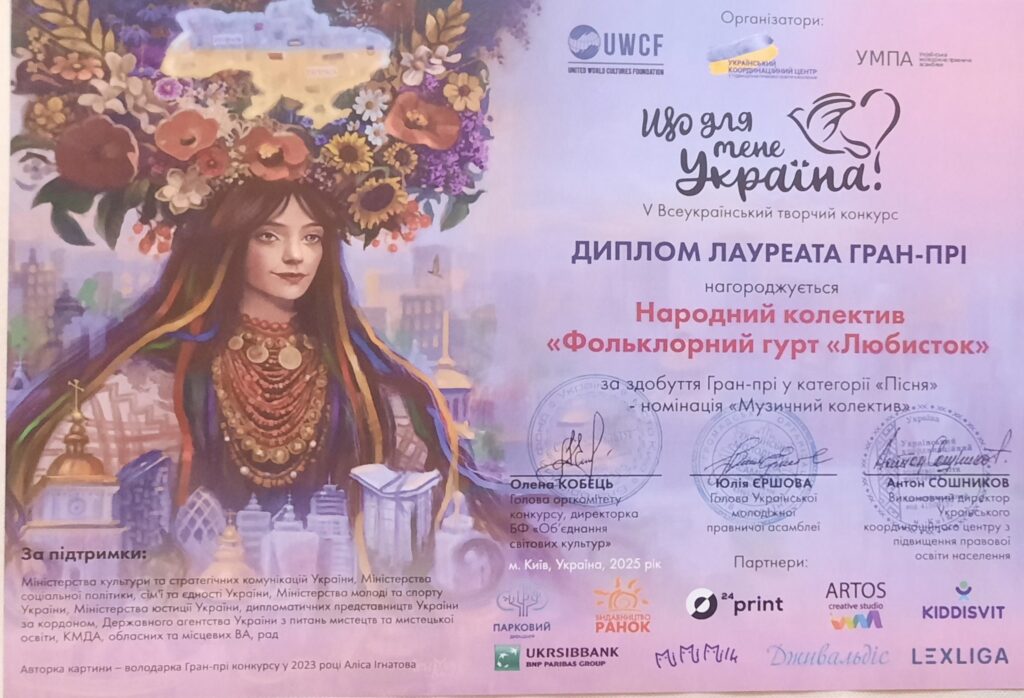Гран-прі у номінації «Музичний колектив» виборов шосткинський народний фольклорний ансамбль «Любисток» ЦЕВ (керівник — Тетяна Стегайло) у V Всеукраїнському творчому конкурсі «Що для мене Україна».