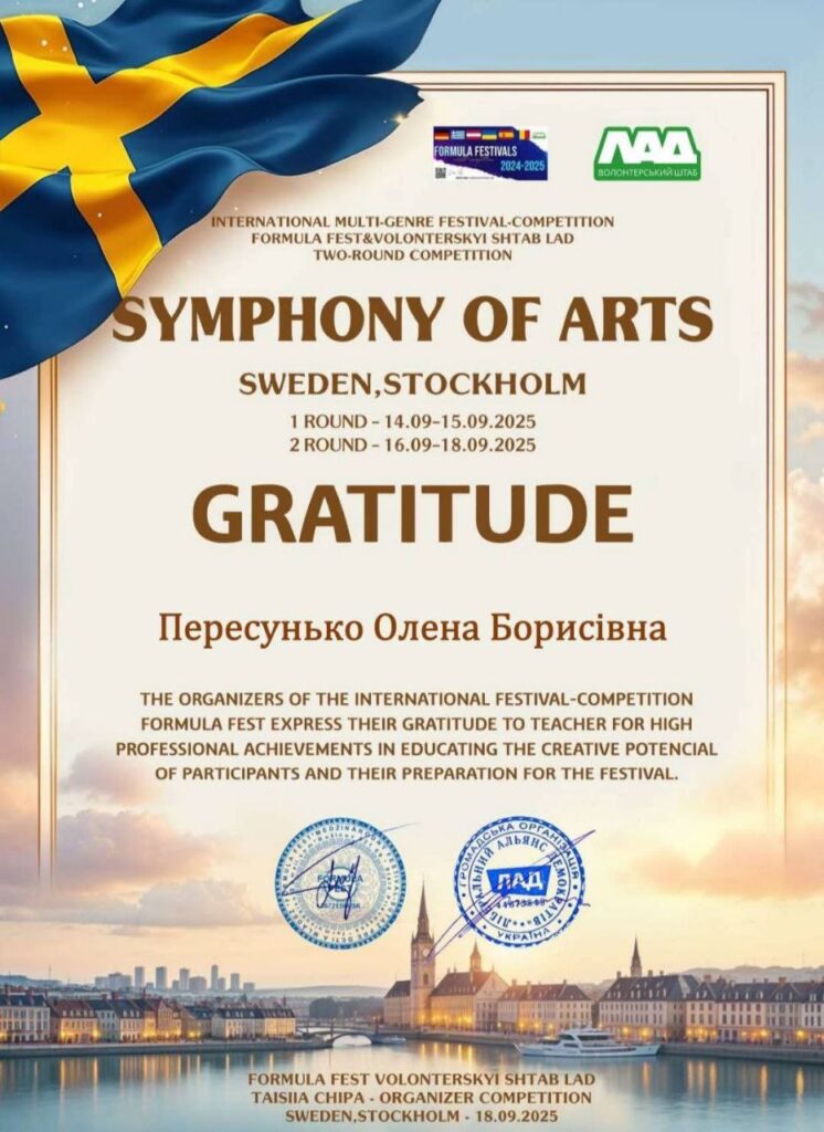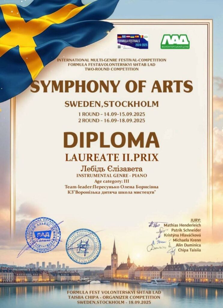 Учениця класу фортепіано Воронізької дитячої школи мистецтв Єлизавета Лебедь гідно представила рідну школу на Міжнародному благодійному двотуровому конкурсі мистецтв «Symphony Of Arts», що проходив у м.Стокгольм (Швеція).