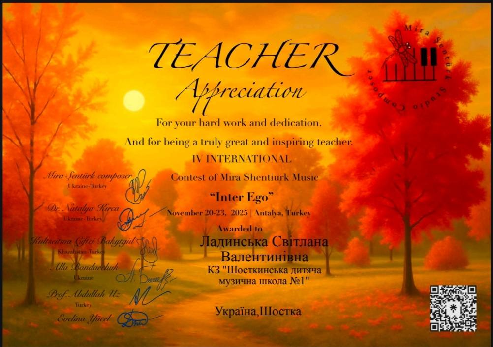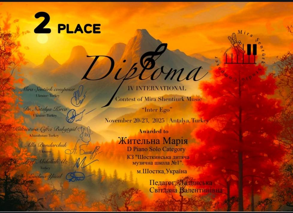 Учениця Шосткинської дитячої музичної школи №1 Марія Жительна стала призеркою престижного IV International Contest of Mira Shentiurk Music “Inter Ego”, який проходив 20–23 листопада 2025 року в місті Анталія (Туреччина).