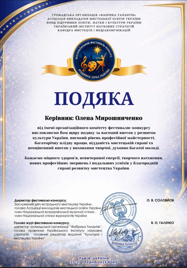 За підготовку переможця викладачка Михайла Олена Мирошниченко була відзначена Подякою за вагомий внесок у розвиток культури України та високий рівень професійної майстерності.