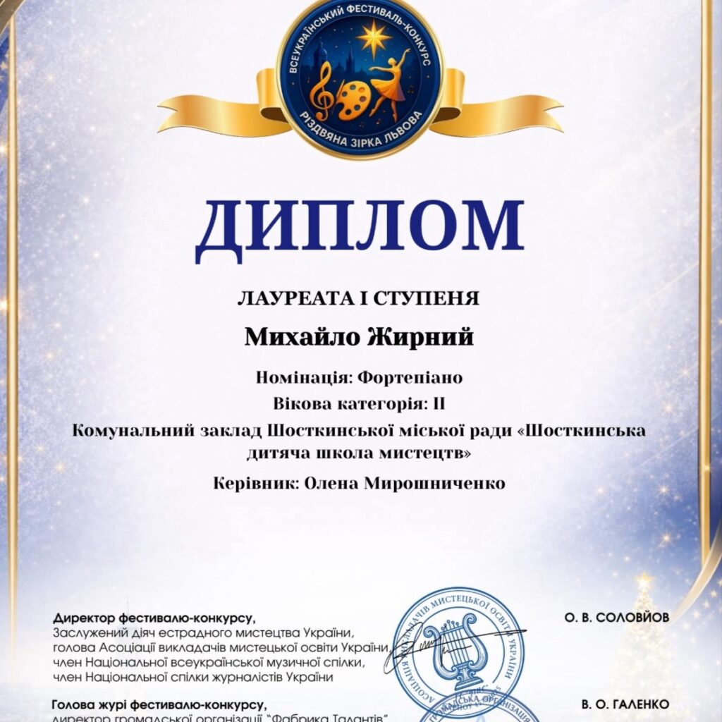Учень 4-го класу Шосткинської дитячої школи мистецтв Михайло Жирний здобув Першу премію на Всеукраїнському фестивалі-конкурсі мистецтв «Різдвяна зірка Львова».